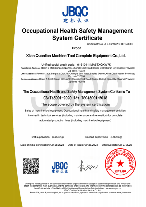 全聯成(chéng)套全面通(tong)過職業健(jiàn)康安全管(guǎn)理體系認(rèn)證證書